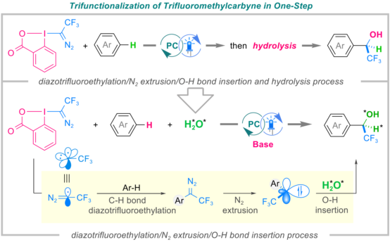 具有三个非键合电子且高度极化缺电子的三氟甲基卡拜(CF3Ċ:)是重氮三氟乙基自由基(CF3Ċ=N2)的等价体,因其具有在一步反应中可以形成三个新化学键的能力而更加引人注目。基于前期对三氟甲基卡拜等价体的研究(Org. Lett. 2021,23, 9256;Angew. Chem. Int. Ed. 2024,63, e202318887),最近该团队报道了一种光催化三氟甲基卡拜三官能化反应,得到了一类1-(杂)芳基-三氟乙基-2-碘代苯甲酸酯化合物,该产物可进一步通过水解转化为在药物化学领域具有重要价值的α-(杂)芳基三氟甲基甲醇。为提高该反应的实用性,简化反应操作,该团队通过添加LiPF₆和H₂O,在温和的条件下一步实现了α-(杂)芳基三氟甲基甲醇的构建。此外,该反应可在太阳光照射下完成产物的克级规模制备,且成功实现了同位素标记三氟甲基甲醇的合成。利用开发的技术,可以快速完成吲哚美辛、黎卢酸药物分子的后期官能化修饰以及LP533401候选药物关键中间体的合成。