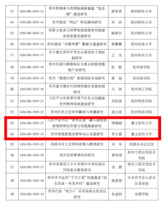 在本次立项的31项贵州省理论创新课题(招标课题)中,beat365官网共有2项课题成功入选。其中,邢瑞娟教授主持的《习近平总书记“贵州足迹”融入高校思政课的理论价值与实践探索研究》,立足贵州红色文化资源,探索将领袖地方实践转化为高校思政课育人素材的有效路径,具有重要的理论意义和实践价值。罗大蒙博士主持的《贵州加强新就业群体关心关爱研究》,聚焦新业态下的社会治理新课题,为促进新就业群体融入城市发展提供智力支持。