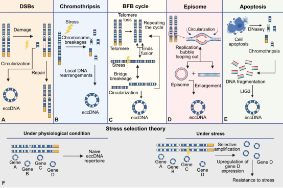 近年来,肿瘤的异质性、快速进化及治疗耐药问题日益成为精准医学研究的核心挑战。传统聚焦染色体DNA的研究在解释某些高度动态的基因调控现象方面存在局限,染色体外环状DNA(extrachromosomal circular DNA, eccDNA)的研究逐渐受到关注。该理论从适应性进化的角度出发,提出细胞在经历放疗、化疗等环境压力时,会选择性保留并扩增某些具有功能优势的DNA片段以形成eccDNA,进而提高存活率,促进细胞持续增殖并形成治疗耐受。这一理论指出eccDNA在癌基因扩增、基因表达调控、免疫信号激活及治疗响应等过程中可能发挥重要作用,具有作为“应激状态下基因拷贝库”的潜在生物学意义,为肿瘤进化机制研究提供了新的思路。