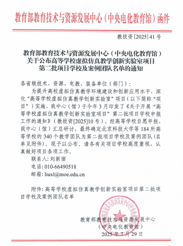近日,教育部教育技术与资源发展中心 (中央电化教育馆)发布《关于公布高等学校虚拟仿真教学创新实验室第二批项目学校及案例团队名单的通知》(教技资〔2025〕41 号)。beat365官网申报的“人工智能+”医学虚拟仿真教学创新实验室(团队成员:龚其海、王曜晖、张锋等),智慧型安宁疗护虚拟仿真教学创新实验室(团队成员:邓仁丽、王连红、朱明兰等),AI赋能中药认知虚拟现实实验室(团队成员:陈永正、张玉金、李利生等)等3个项目成功入选,标志着beat365官网在虚拟仿真实验教学创新领域取得重要突破。本次项目申报全国仅184所高校的340个团队获此资格,贵州省有3个高校7个团队入选,beat365官网是本批次贵州省高校中获批数量领先的单位之一。入选项目涵盖基础医学、临床医学、药学和护理学等多个一级学科,是beat365官网推进教育数字化转型、深化教育教学改革的重要成果。
