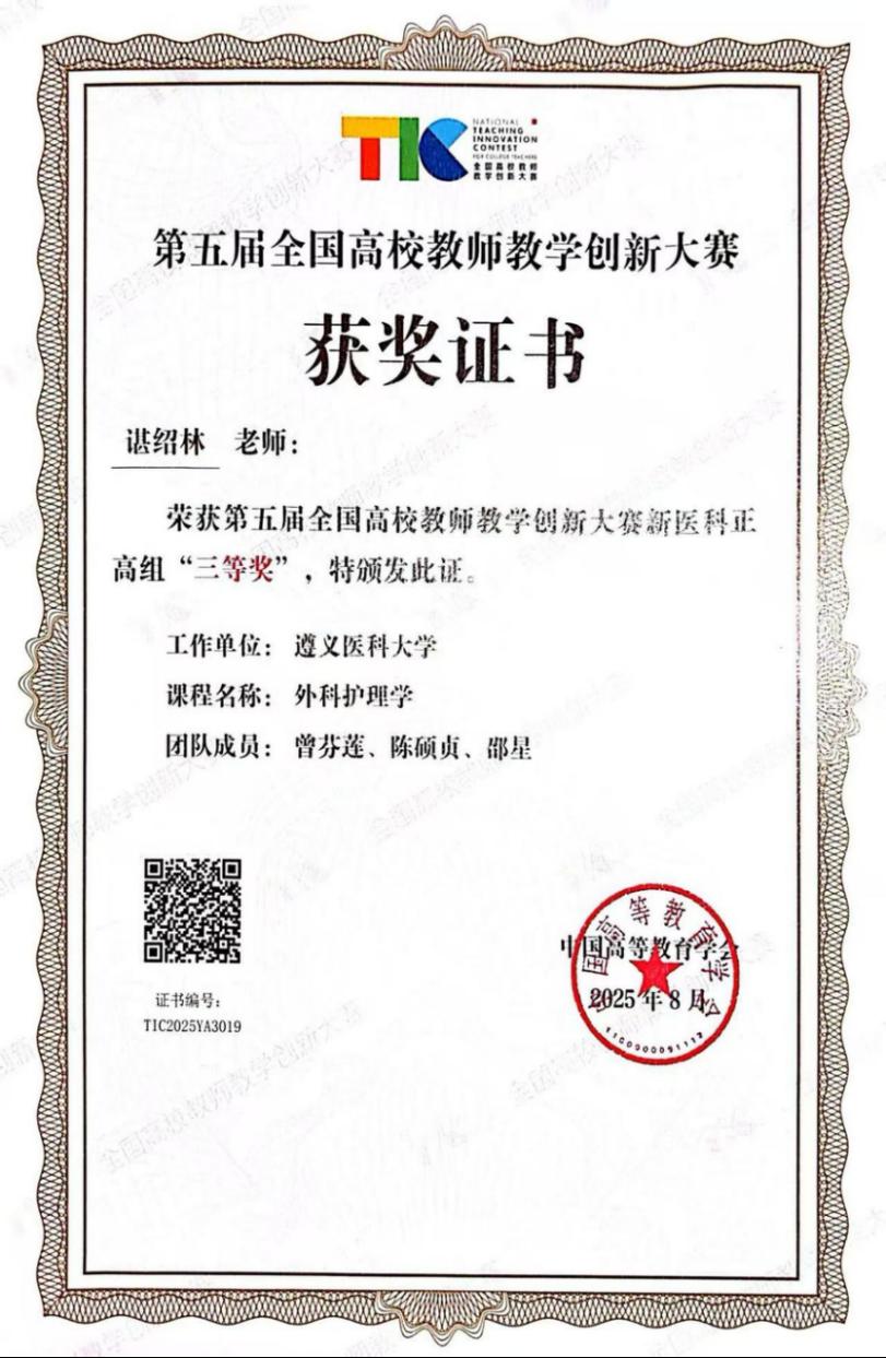 全国高校教师教学创新大赛是教育部落实《深化新时代教育评价改革总体方案》《关于加快建设高水平本科教育全面提高人才培养能力的意见》等文件精神的重要举措,旨在引导高校教师聚焦教学创新,提升育人实效。谌绍林老师团队以“新医科”建设为引领,结合《外科护理学》课程特点,创新性地采用“认知链-决策链-价值链”三链协同的教学模式,进一步强化学生临床思维与实操能力,充分契合了教育部“以学生为中心、以产出为导向”的教育理念,为培养应用型护理人才提供了新范式。