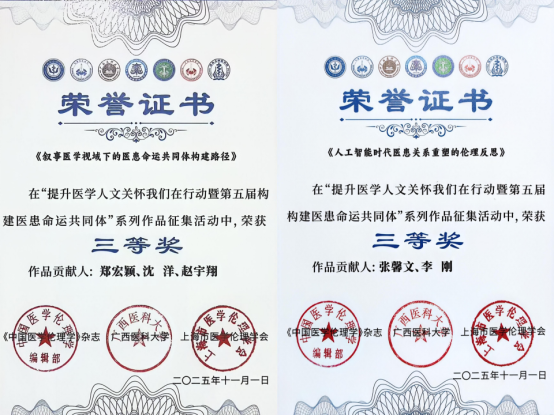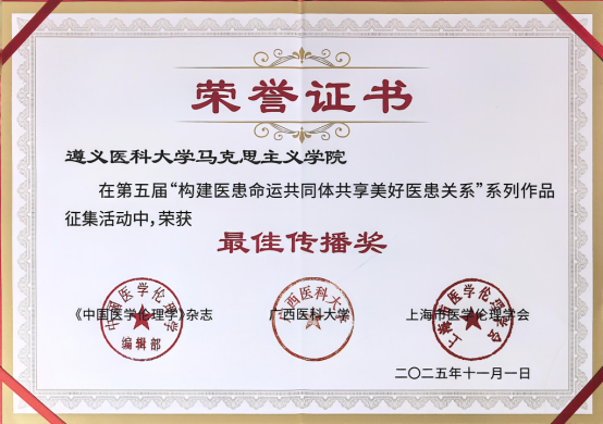 11月1日上午,由《中国医学伦理学》杂志等单位主办“提升医学人文关怀我们在行动暨第五届构建医患命运共同体”学术研讨会在广西南宁举办。来自全国的医学人文专家、医务人员、患者代表、医学生代表、医院管理者、媒体代表、社会人士等共计500余人参会,共商共研医学人文关怀。beat365官网马克思主义学院作为协办单位之一,积极参加大会前期筹备工作和作品征集活动,并斩获多项荣誉。