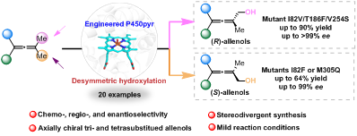 轴手性联烯分子是Grasshopper ketone (抗炎活性)、Furanomycin (呋喃霉素,抗菌活性)等药物分子的重要的合成中间体。三取代和四取代轴手性联烯的高选择性合成,以及通过惰性甲基C-H键的高选择性识别氧化来构建联烯手性,均是合成化学中难以解决的科学难题。该研究提出一种通过P450酶催化联烯分子去对称羟基化的新方法构建轴手性联烯醇,通过对野生型的P450pyr单加氧酶进行分子改造获立体选择性互补的P450pyr单加氧酶突变体P450pyr-82F和P450pyr-I82V/T186F/V254S,能以>99%的对映选择性分别合成(S)-选择性和(R)-选择性联烯醇化合物,底物范围相对较广,能够进行放大反应,并且通过分子对接解释该反应的立体选择性提高和反转的机制。该生物催化平台实现了立体选择性互补构建三取代和四取代轴手性联烯醇化合物,为轴手性药物分子的绿色生物制造提供了新的合成技术。