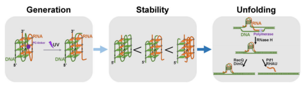 hG4是由富含鸟嘌呤(G)的DNA与RNA链组成的分子间G-四链体结构,在转录调控与端粒稳定中扮演关键角色。然而,由于传统方法无法制备均一且组成可控的hG4,其稳定性与动态调控机制长期不明。该研究设计并验证了一种基于PC-linker的紫外诱导切割新策略,成功实现了从分子内G4向分子间G4的可控转化,并可灵活调节DNA与RNA链的比例,为系统研究hG4的性质奠定了方法学基础。