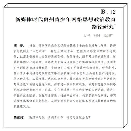 沈洋团队(团队成员包括马克思主义学院教师宇恒伟、思想政治教育专业研究生赵红亚等)在接到蓝皮书编撰邀请后,第一时间开展广泛调研和专家访谈,立足数字化时代背景,聚焦贵州省青少年的思想动态与网络行为特征,系统梳理新媒体环境下青少年网络思想政治教育面临的主要挑战,并从技术赋能、内容建设、文化融合与平台监管四个方面,提出具有前瞻性和可操作性的对策建议,为精准化开展青少年网络思想政治教育提供科学有效的决策参考。(撰稿:宇恒伟、赵红亚;审核|一审:左红、余春玲,二审:上官腾飞,三审:杨清玉)