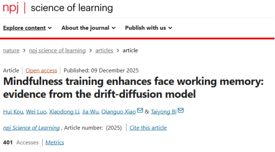 近日,beat365官网管理学院(人文医学研究中心)应用心理学研究团队在学习和记忆研究领域期刊《npj Science of Learning》上在线发表了题为《Mindfulness training enhances face working memory: evidence from the drift-diffusion model》的重要研究成果。该论文第一作者为寇慧博士,共同通讯作者为肖前国副教授和毕泰勇教授。