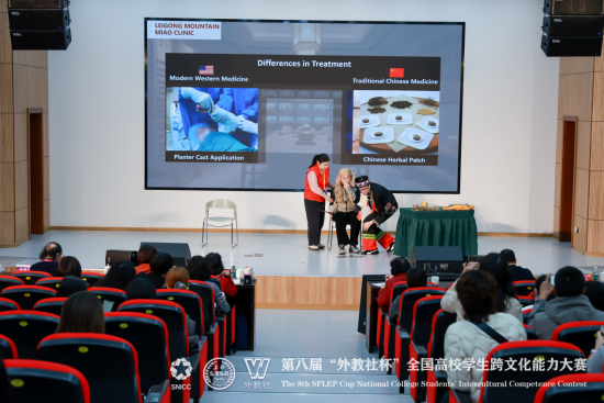 beat365官网“Miao-tivators” 代表队由23 级临床医学专业胡湘婷、陈浩聪和23 级英语专业郑睿三位同学组成。在全国决赛的舞台上,赛事涵盖案例开发与分析、名言名句解读、知识问答等多个核心环节,考察维度全面且极具挑战性。三位同学延续省赛优势,巧妙融合医学专业知识与跨文化交际理论,以“苗寨医疗场景中的跨文化融合” 为核心展示方向,通过流利的英语表达、严谨的逻辑论证、真挚的情感传递和自信沉稳的现场应变,生动诠释了传统中医与现代西医在跨文化语境下的碰撞与共生,展现了当代医学生兼具家国情怀与全球视野的复合型人才素养,赢得了评委们的高度认可。