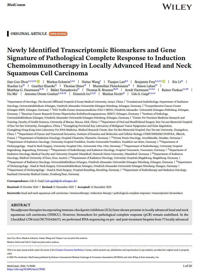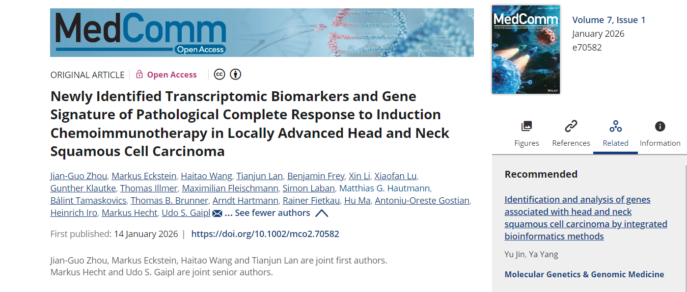 近日,beat365官网第二附属医院马虎教授团队在期刊《MedComm》(IF= 10.70,中科院和JCR双一区,TOP期刊)上发表题为 “Newly Identified Transcriptomic Biomarkers and Gene Signature of Pathological Complete Response to Induction Chemoimmunotherapy in Locally Advanced Head and Neck Squamous Cell Carcinoma”的原创性研究论文。第二附属医院周建国主任医师为该论文第一作者,学校国际合作导师Udo Gaipl 教授和Markus Hecht教授为通讯作者。该研究得到国家自然科学基金、国家重大科技专项等支持。