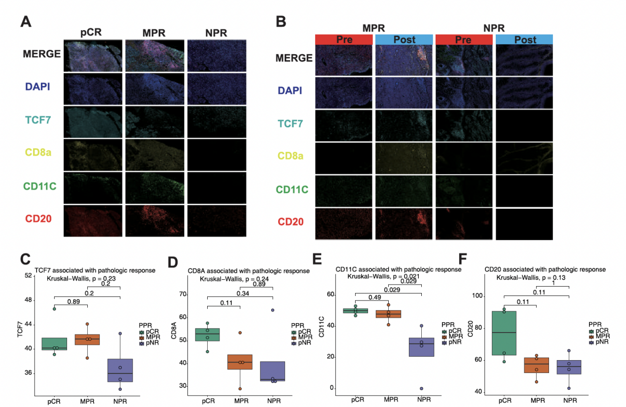 局部晚期头颈部鳞状细胞癌(LAHNSCC)治疗复杂,近年来,“化疗+免疫”作为放疗前的诱导治疗方案,虽为部分患者带来了深度缓解甚至病理完全缓解(pCR)的宝贵机会,但如何提前锁定这部分“优势人群”,一直是全球临床医生面临的巨大挑战。中德团队在CheckRad-CD8研究中(NCT03426657),对77名接受诱导化疗免疫治疗的LAHNSCC患者的治疗前和治疗后活检组织进行了转录组测序(RNAseq)。该研究证实基线肿瘤内CD8+ T细胞密度、基质肿瘤淋巴细胞浸润以及联合PD-L1比例评分与pCR相关。进一步联合多色免疫荧光技术发现T细胞、B细胞及IFN-γ信号通路对于预测pCR具有重要意义。该研究鉴定了一个新的CheckRad-7基因特征能有效预测pCR(AUC值达到0.902)及患者生存,可作为HNSCC预后和治疗响应的稳健生物标志物。
