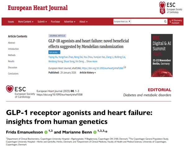 1月29日,遵医附院心血管内科赵永超副研究员作为第一作者之一,在国际心血管领域顶级期刊《European Heart Journal》(欧洲心脏杂志,中科院1区,Top期刊,IF=35.6)合作发表了题为“GLP-1R agonists and heart failure: novel beneficial effects suggested by Mendelian randomization”的原创性研究论文。该研究利用大规模遗传数据,系统揭示了胰高糖素样肽-1受体激动剂(GLP-1RA)在降低心力衰竭风险中的关键作用及其潜在机制,为该类药物在心力衰竭治疗中的临床应用拓展提供了重要的遗传学证据,该工作同期得到了丹麦哥本哈根大学医院Frida Emanuelsson和Marianne Benn教授的积极述评。