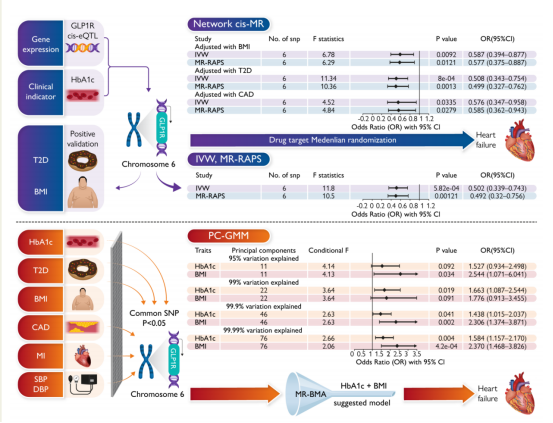 心力衰竭是2型糖尿病常见的心血管合并症,其发病风险在糖尿病患者中显著升高。因此,降糖药物在心衰防治中的作用日益受到重视。近年来,GLP-1受体激动剂在心血管保护方面的效应备受关注,但其确切机制尚未完全阐明。目前临床指南主要推荐其用于高危糖尿病患者以降低心肾风险,然而其获益究竟源于代谢改善(如降糖、减重),还是存在独立于代谢的心血管直接作用,目前仍不明确。本研究采用孟德尔随机化方法,通过模拟药物靶点的遗传变异,评估了GLP-1受体激活对心力衰竭的因果影响。证实GLP-1受体激动剂可显著降低心衰风险。虽然该作用主要由体重减轻介导,但在校正混杂因素后,仍观察到独立于血糖与体重下降的直接心脏保护效应。这提示其作用不仅限于代谢调节,也可能为非糖尿病、非肥胖心衰患者提供治疗潜力。机制上,药物可能通过改善心肌能量代谢、微循环及调节炎症等多途径发挥作用。本研究深化了对GLP-1受体激动剂心血管效应的理解,为心衰的精准防治与药物研发提供了新方向。