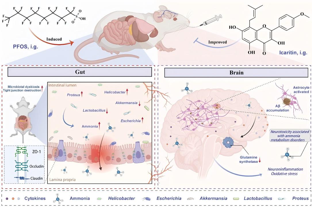 全氟辛烷磺酸(PFOS)是一种持久性环境污染物,与认知功能障碍密切相关,其机制涉及神经炎症、氧化应激和代谢紊乱。目前,针对此类环境毒素诱导的神经退行性病变的治疗手段有限。近年来,“微生物-肠-脑轴”被视为神经疾病干预的新靶点,但PFOS如何通过该轴导致认知损伤,其具体机制尚不明确。