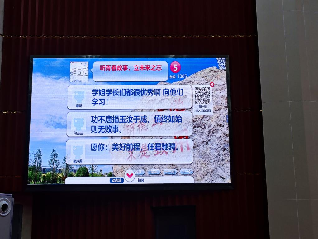 报告会设置了现场互动大屏幕,与会同学可随时将报告会中的所思所感及对学长学姐的祝福发送到大屏幕,同步滚动播放,大家参与积极性高,全场共收到1100余条评论。很多同学在评论中为自己鼓劲,希望自己毕业时也能作为优秀毕业生代表站上舞台,分享自己的遵医故事,为后来者点亮微光。(审核:一审杨艳、二审杨清玉、三审李均,撰稿:郭念念,摄影:李爱国、吴虞娱)